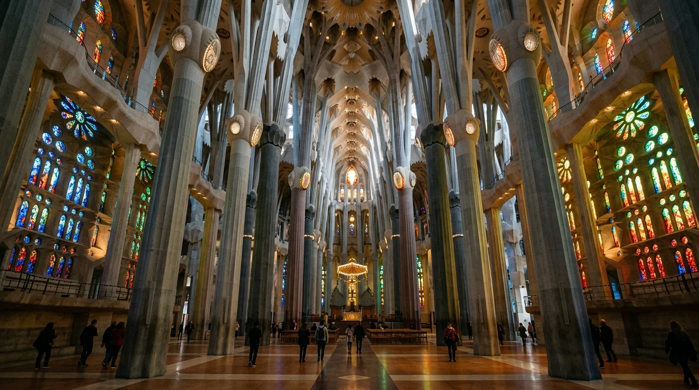 Antoni Gaudí’s unfinished basilica is one of the most extraordinary buildings in the world — a towering, organic masterpiece that looks like it grew rather than was built. Construction began in 1882 and continues today, funded entirely by visitor tickets. The exterior is covered in symbolic sculptures; the interior floods visitors with kaleidoscopic light through massive stained-glass windows in hues of amber, blue, and green.